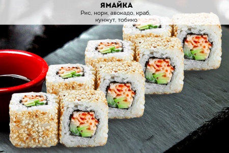 Рис, нори, снежный краб, сливочный сыр, огурец, тобико.
