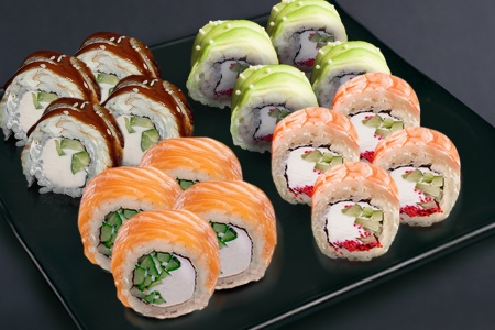Ролл карибы с авокадо 1/2, ролл канада 1/2, ролл карибы 1/2, филадельфия классика 1/2.
